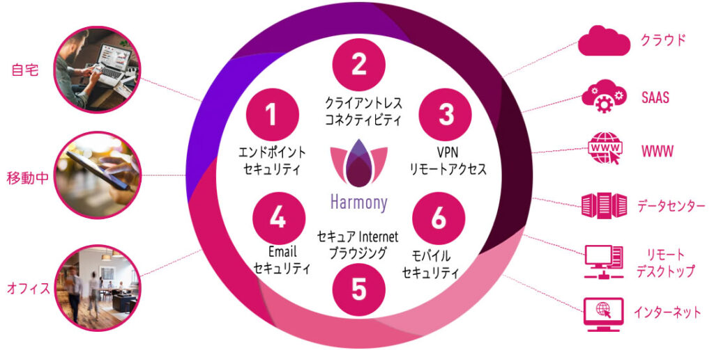 チェックポイント Harmony(ハーモニー)は、6つのセキュリティ製品を統合して、妥協のない保護とシンプルな構成を提供します。